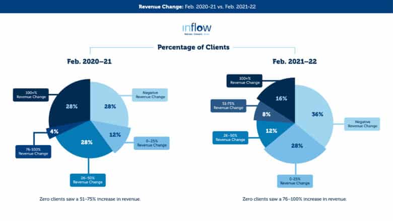 Of those clients who saw increased revenue in 2020–21, 38% more than doubled their revenue. Making this type of growth a pattern is incredibly difficult, especially as the pandemic recedes and people shift into “new normal” spending habits.