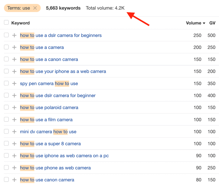 There’s also search volume around “how-tos” related to using cameras — a great topic to assert the brand’s authority in the space and especially to reach beginners interested in photography: