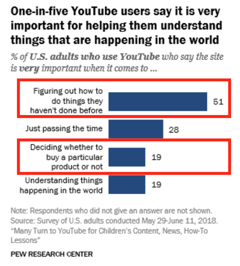 According to a Pew Research Center survey, 51% of YouTube users use the platform to figure out how to do things they haven’t done before, and 19% use the platform to decide whether to buy a particular product or not.