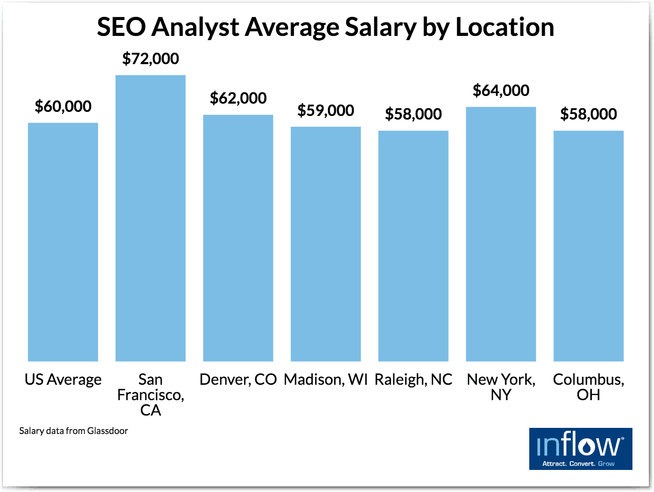 As you would expect, marketer salaries are higher in the more expensive cities. In order to determine how SEO analyst salaries fluctuate due to location, we used Glassdoor to analyze SEO analyst salaries in different cities.