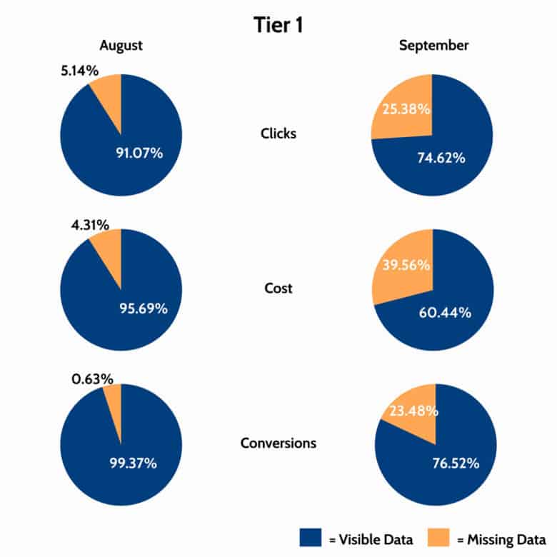 Although the percentage of clicks are relatively close, the percentage of spend missing is 10% higher in both Tier 1 and Tier 2 than in Tier 3. Smaller advertisers are losing more visibility on where their budgets are being spent than advertisers that are spending more per month. This is crazy! Tier 1 and 2 advertisers have less budget and need that data to optimize their campaigns even more.