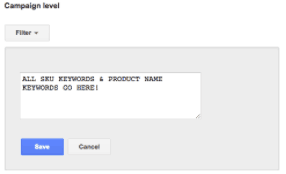 Once the campaign is built, select keywords and under the campaign level negative keyword list, add all SKUs and product names as negative keywords.